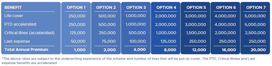 | Critical Illness | Payment of 50% of the death benefit to cater for treatment for first time diagnosed critical illnesses. Examples of critical illnesses (Heart Attack, Stroke, Cancer, Coronary Artery Disease, Major Organ Transplant, Kidney failure, Paraplegia or paralysis). |